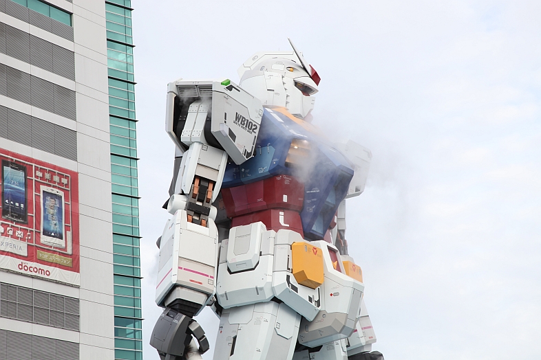 | Every hour, a show of the 1:1 Gundam moving its head, releasing steam, and lighting its eyes is performed