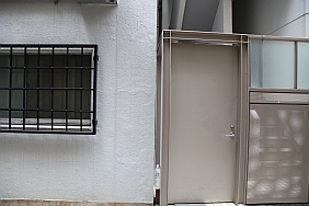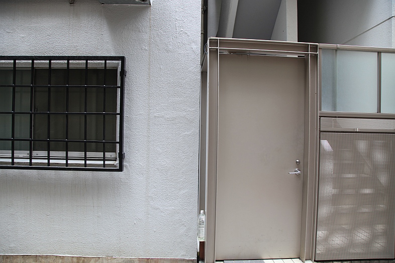 | [EP01] In the alley, Rikuo and Masakazu looking at the front door of Eve no Jikan. In real life, it is a back door of the building