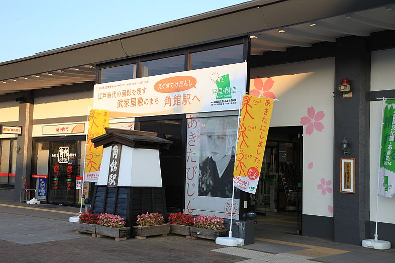 | A parade float 山車 displayed just outside the Kakunodate station 角館駅