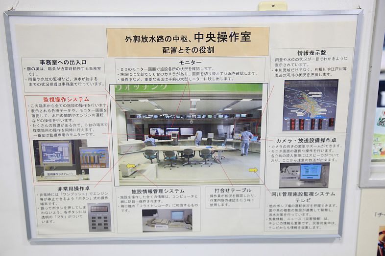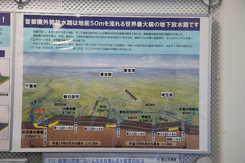 The Metropolitan Area Outer Underground Discharge Channel 首都圏外郭放水路 (Shutoken Gaikaku Housuiro) is the world's largest underground water discharge facilities (50 meter underground, 6.3 km long, water discharge rate 200 cubic meter per second) for flood prevention for the north east side (the flatter side) of Tokyo Metropolitan Area 首都圏.