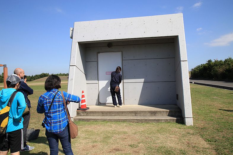 | Walking towards the northern end of the football pitch, you can see a small white structure in the left, which is the entrance to the Underground Temple 地下神殿. The brown building in the middle is the cover of one of the vertical shaft of the facilities